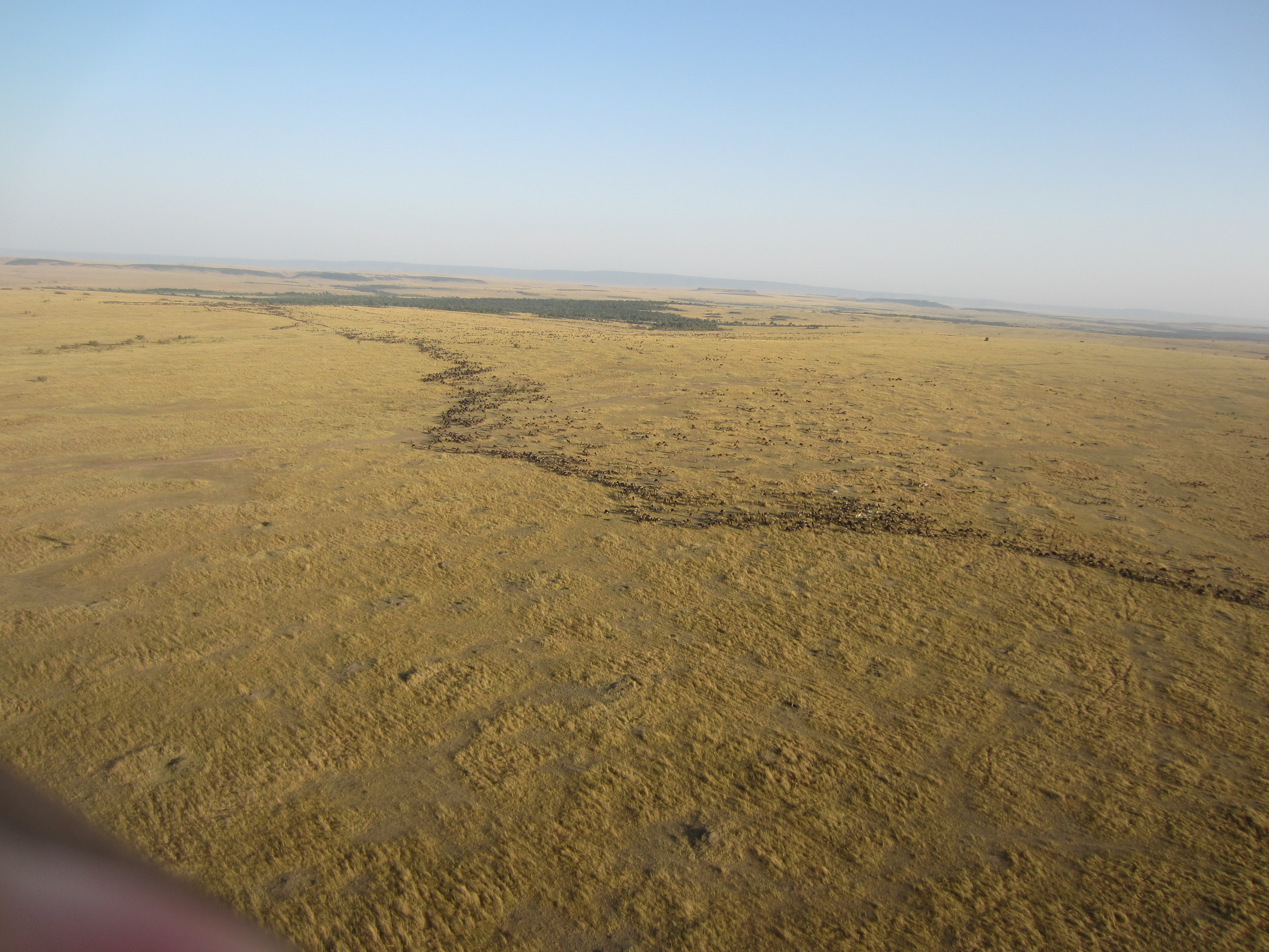 That looks like a river but it's actually the edge of the wildebeest herd. If you zoom in you can see all the beasts.