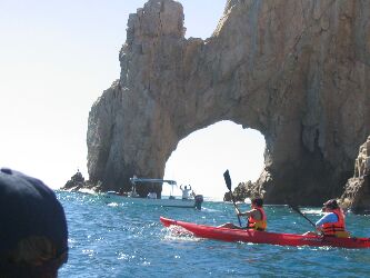 We flew from Fort Lauderdale to San Diego, where we boarded the Legend of the Seas, a sister ship to the Enchantment of the Seas. The ship did not depart until about 10:00 PM, before which we were treated to a parade through San Diego harbor of boats decorated for Christmas. After a “sea day,” our first stop was Cabo San Lucas at the tip of Baja California. The end of the peninsula has some spectacular rock formations. The Legend anchored in the bay and we tendered ashore for a kayaking adventure (that’s not us; our boat was, of course, blue).