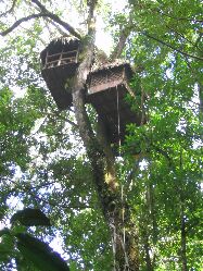 In Zip-lining cables are strung between trees, up in the canopy, and one attaches a pulley ( and a safety harness!) and goes zipping from tree to tree, a hundred or so feet above the ground. Its great fun! Our tour had about 7 zip lines ( and a Tarzan swing rope!). This tree house was between two of them.